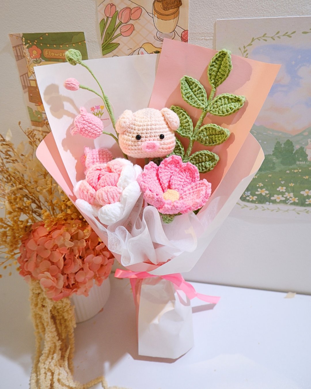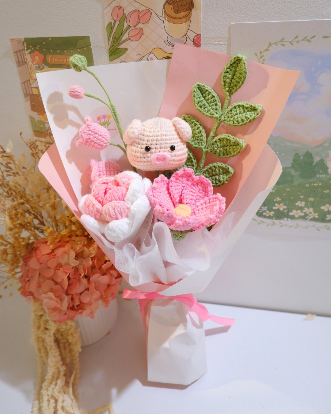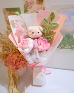 A charming handcrafted bouquet that brings together softness, sweetness, and a touch of whimsy. At its heart sits an adorable crocheted piglet, nestled among delicate pink blossoms and budding stems, symbolising warmth, care, and gentle affection. The pastel wrapping and airy ribbon enhance its dreamy, romantic feel, making it a perfect gift for birthdays, anniversaries, or simply to brighten someone’s day.