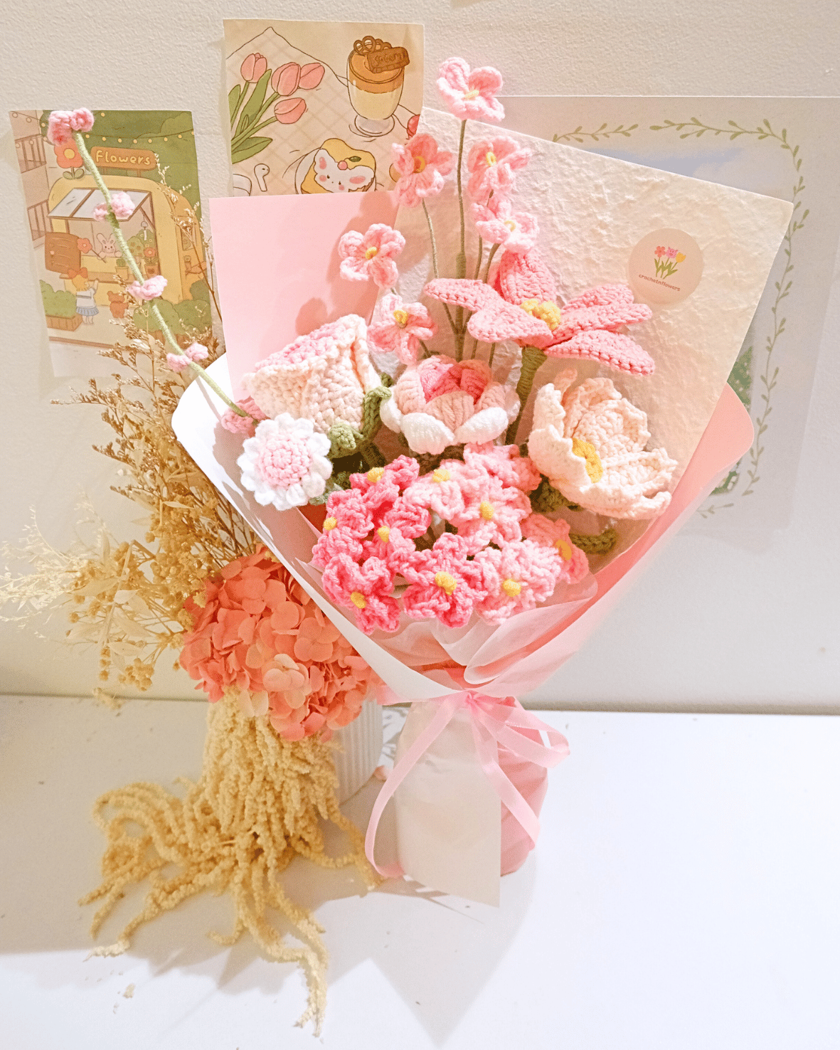A soft symphony of handcrafted crochet blooms, this bouquet blends gentle shades of pink with delicate floral details to capture the beauty of springtime. Featuring roses, lilies, cherry blossoms, and clusters of tiny blossoms, each piece is lovingly crocheted to last forever.