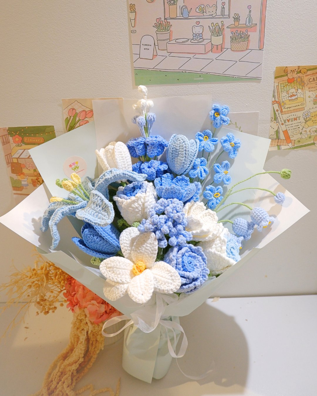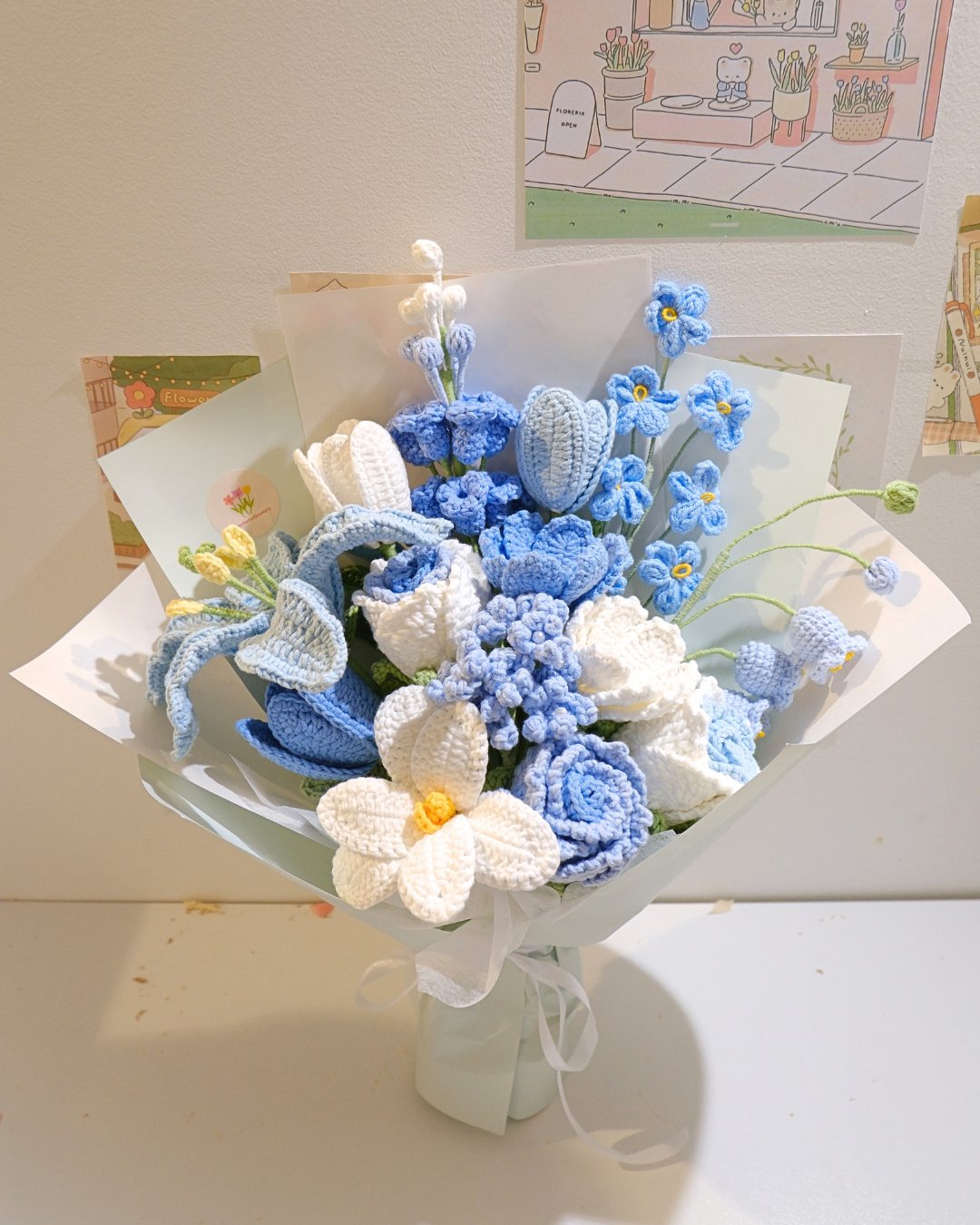 Like a quiet message carried on a spring breeze, the Celestial Whisper Bloom captures the hush of sky-blue horizons and cloud-soft petals. This handcrafted crochet bouquet weaves together dreamy forget-me-not tones, creamy blossoms, and gentle textures into something that feels both tender and timeless. Each stitch holds a sense of stillness—like a paused moment between heartbeats—making it a perfect keepsake for unspoken feelings, soft memories, and love that lingers long after the moment has passed.