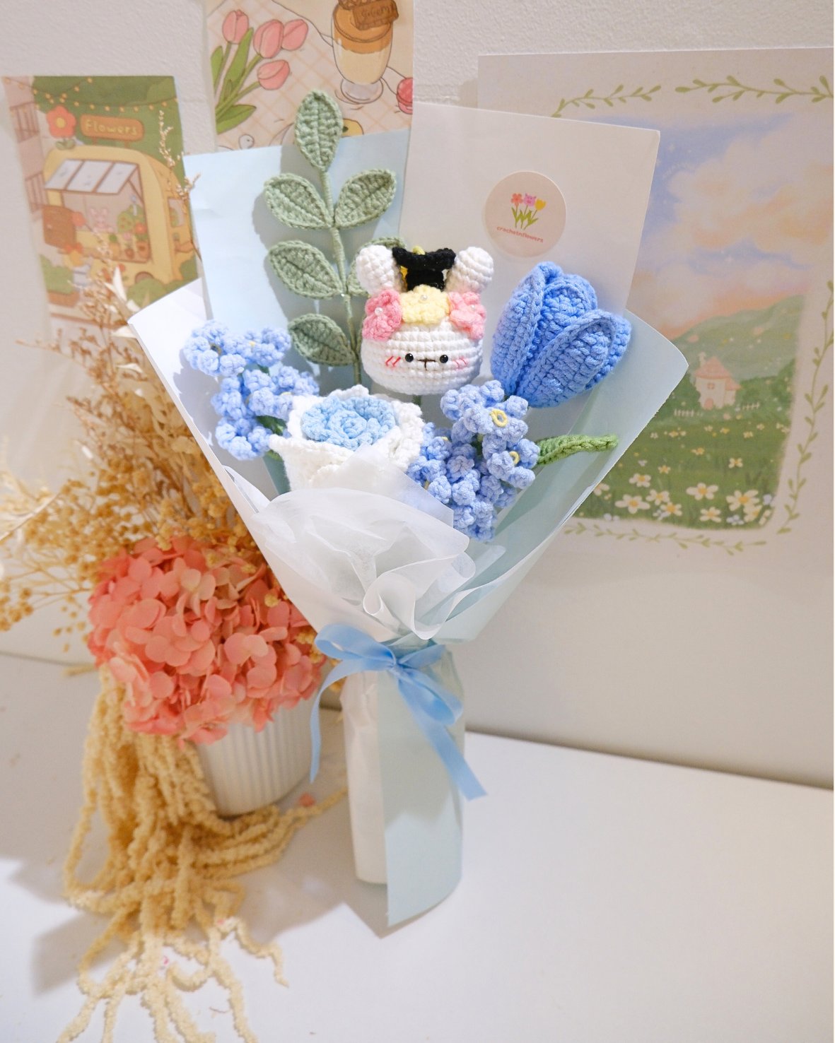 Wrapped in soft layers of white and sky-blue paper and finished with a satin ribbon, this bouquet is perfect for birthdays, anniversaries, or anyone who deserves a little handmade magic. A gift that never wilts, only warms hearts. 🌸🐰💙
