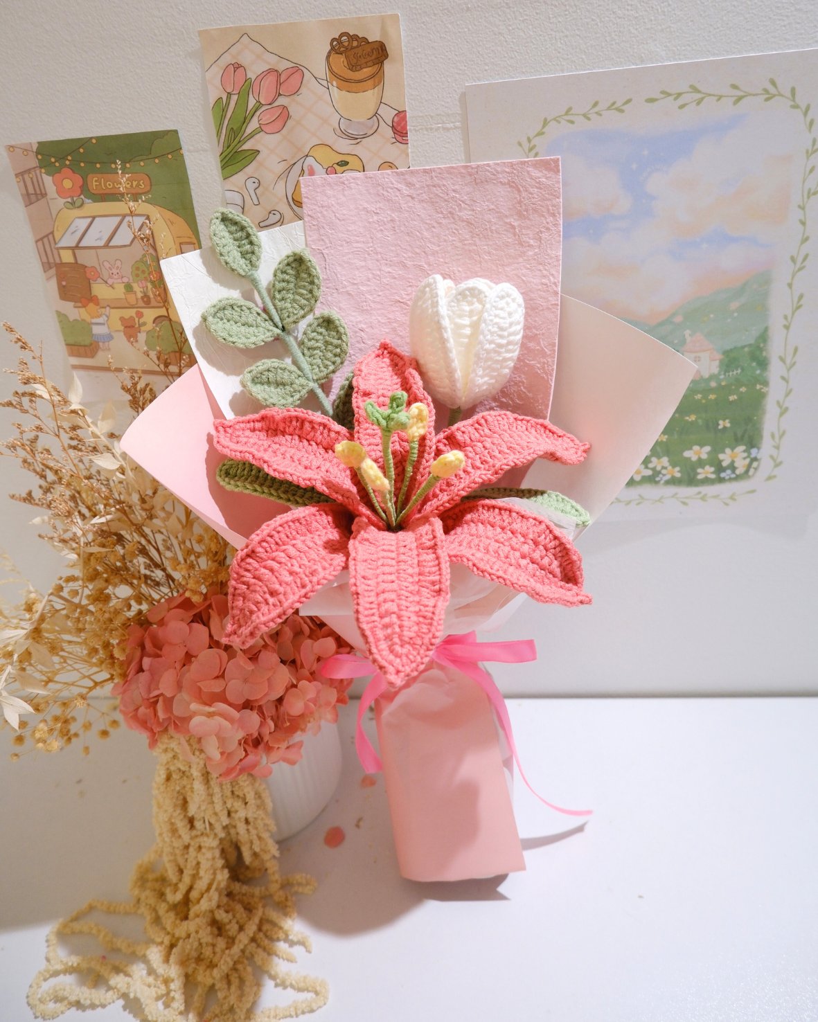 Radiant and full of charm, the Coral Lily Bouquet features a stunning crochet lily paired with a soft cream tulip and leafy greens. Its coral tones bring a touch of warmth and vitality, symbolizing confidence, joy, and heartfelt admiration. Wrapped in pastel pink and finished with a satin bow, this bouquet is a statement piece — perfect for celebrating milestones, brightening someone’s day, or adding a pop of handmade elegance to any space.💕