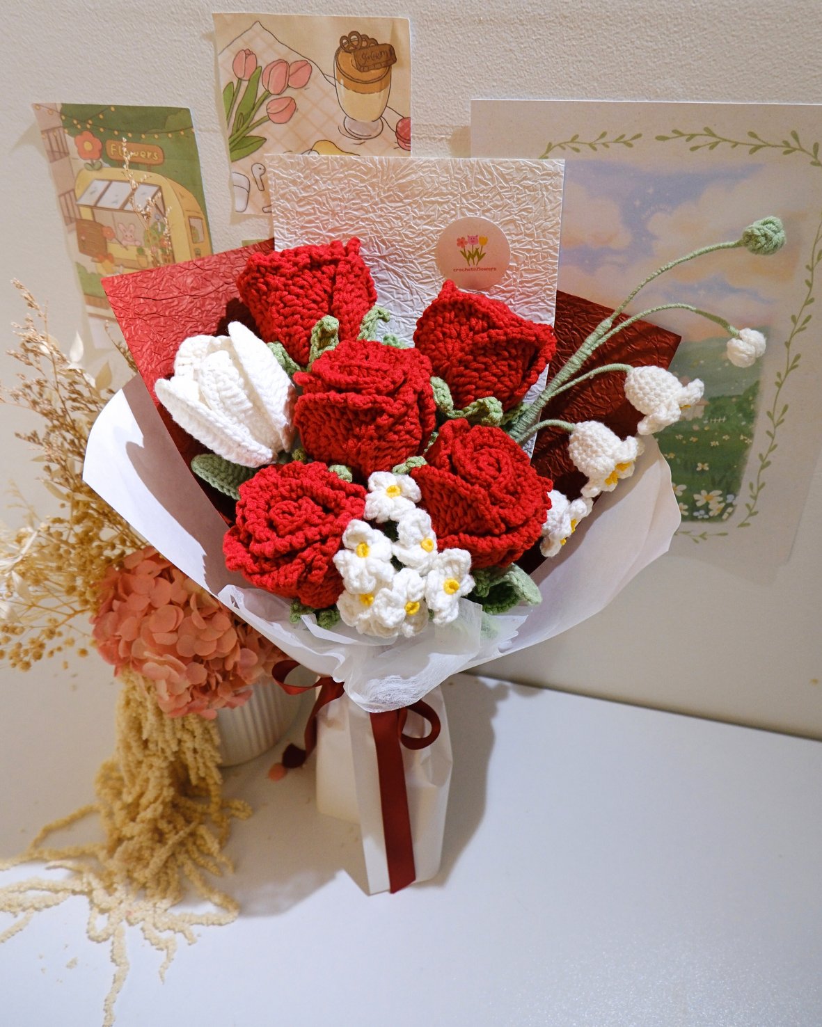 Crimson Promise is a romantic, hand-crocheted bouquet that speaks of deep love and lasting devotion. Featuring rich red roses at its heart, delicately paired with soft white blossoms and lily-of-the-valley accents, this bouquet symbolises passion, purity, and heartfelt promises. Thoughtfully wrapped in textured layers and finished with a classic ribbon, it’s a keepsake designed to never wilt—perfect for anniversaries, Valentine’s Day, or simply to say “I love you” in a way that lasts forever.