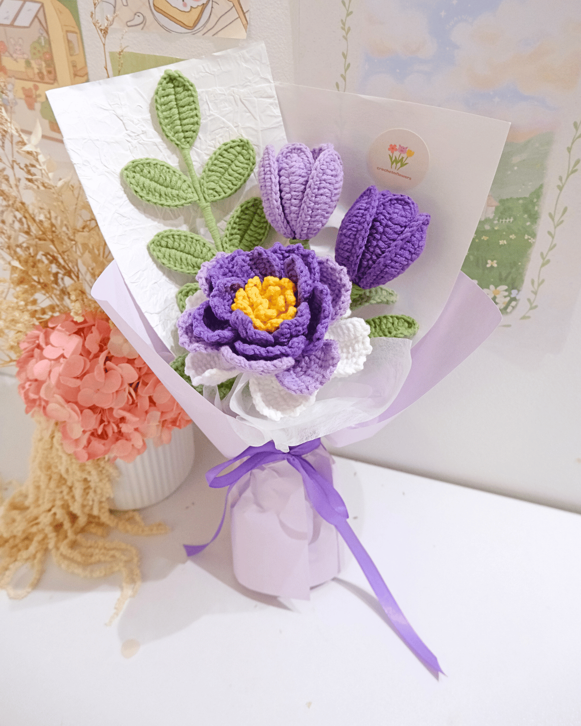 A timeless bouquet that never fades, this hand-crocheted arrangement features soft lavender tulips and a blooming purple peony, accented with fresh green leaves. Each petal is lovingly handmade with premium yarn, creating a delicate yet durable keepsake that captures the beauty of real flowers without the worry of wilting.