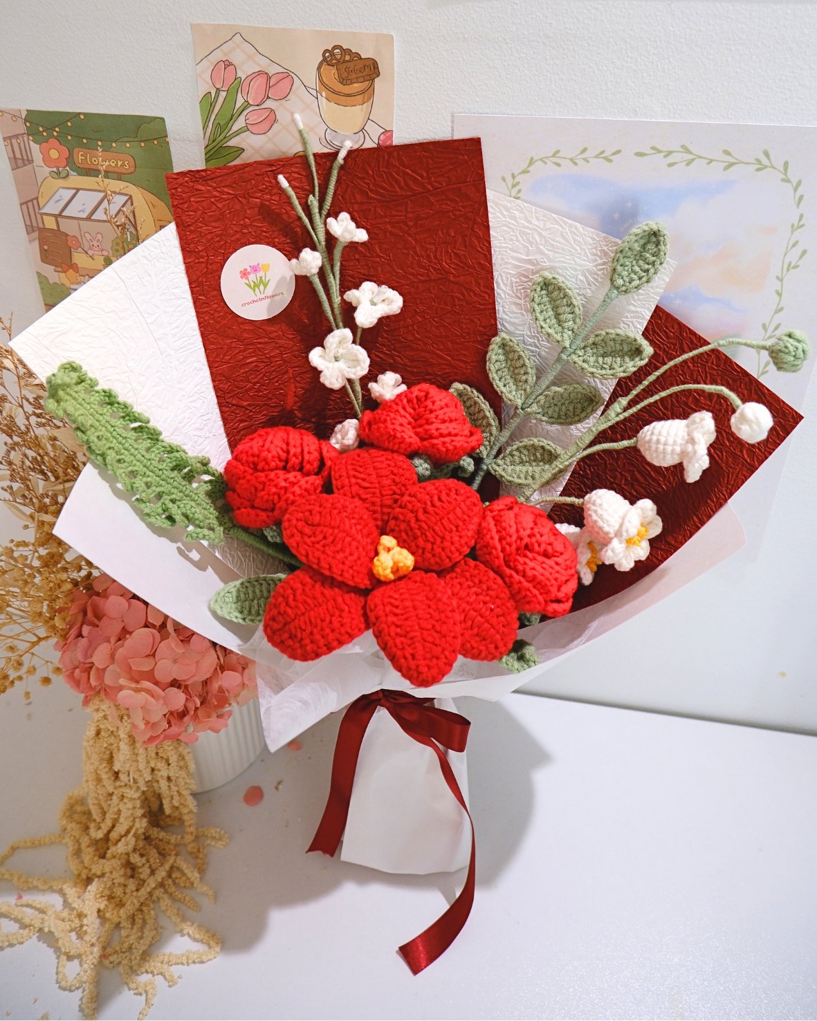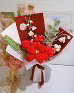 Scarlet Devotion is an everlasting crochet bouquet that speaks of deep affection and unwavering love. The bold red feature flower is softened by delicate white blossoms and earthy green foliage, creating a romantic yet elegant balance. Wrapped in rich red and ivory layers and tied with a satin ribbon, this bouquet is a timeless keepsake—perfect for anniversaries, meaningful milestones, or a heartfelt “I love you” that lasts forever.