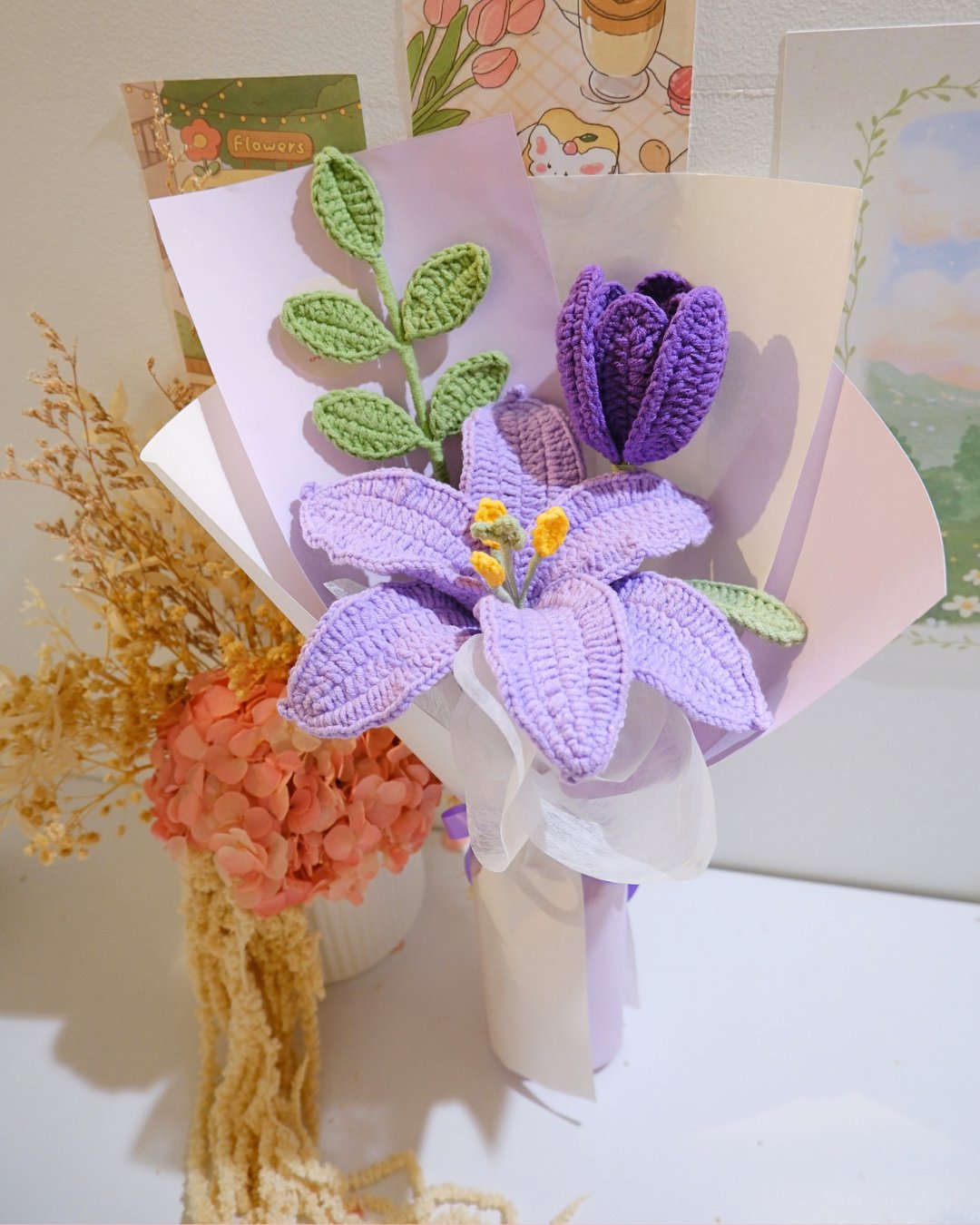 Soft as twilight and rich with quiet elegance, the Violet Reverie Bloom feels like a dream suspended in time. Centered around a graceful lavender lily in full bloom, accented by deeper violet buds and fresh green leaves, this handcrafted crochet bouquet captures the poetry of a moment just before dusk. Gentle yet expressive, it speaks of admiration, serenity, and a love that feels both calm and deeply rooted—perfect for someone who brings a sense of peace and beauty into your world.